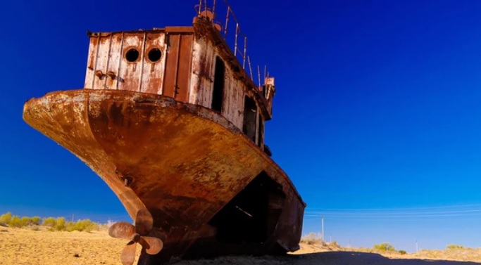 El Mar de Aral, en Asia Central, es un símbolo de cómo la Tierra cambia de forma drástica. Hoy, cuando su superficie se redujo más de un 60%, las antiguas embarcaciones se oxidan al sol y descansan clavadas en la arena.