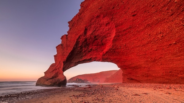 Esta playa en Legzira, muy cerca de Sidi Ifni, Marruecos, era famosa por sus arcos de piedra de color rojizo. Es bañada por el Atlántico, con un oleaje salvaje que atrae a muchos amantes del surf.