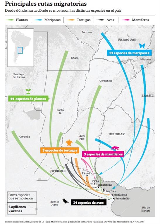 El centenar de especies que tuvieron una respuesta ecológica frente a los cambios se divide en 44 plantas vasculares, ocho arácnidos (seis opiliones y dos tipos de arañas), 33 clases de mariposas y polillas, tres de tortugas, 24 de aves y tres mamíferos. Un ejemplo de los arácnidos es la especie denominada Nefila. «Es una araña inofensiva, pero empezamos a recibir muchas consultas en la zona de La Plata, porque es de gran tamaño y de color verde. Una de las características que tiene es que sus redes son muy fuertes, incluso pueden atrapar un pájaro», detalló Agnolin. Y agregó que la especie antes no llegaba más al sur de la provincia de Corrientes.