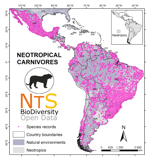 El artículo resultante de este enorme esfuerzo multiinstitucional muestra una base de datos de CARNIVOROS NEOTROPICALES de 99.605 registros provenientes de 21 países, desde la frontera norte de Neotrópico (incluido México) al sur austral de Sudamérica (Argentina y Uruguay); representando el mayor conjunto de datos sobre distribución de carnívoros salvajes jamás presentado para esta región. Este documento de datos es parte de NEOTROPICAL, ATLANTIC, BRASIL e Iniciativa de la serie AMAZONIA que tiene como objetivo recopilar datos sobre la biodiversidad dentro de cada región y ponerlos a disposición del público, para su aprovechamiento en generar más información y que eso ayude a tomar mejores decisiones sobre el manejo y conservación de este conjunto muy importante de la biodiversidad neotropical.