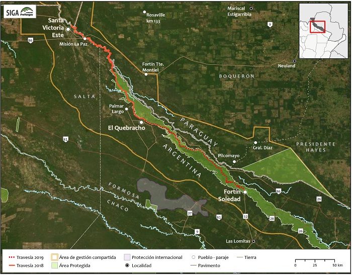 Como es costumbre en la Fundación ProYungas, realizamos una travesía de unos 10 días, en este caso como continuación del recorrido que realizamos el año pasado por el río Pilcomayo entre las localidades de Santa Victoria Este en Salta y El Quebracho en Formosa. Recorrimos en piraguas este paraíso natural, a través de bañados, lagunas, palmares y cursos de agua. Un mosaico de comunidades naturales y de espacios generados por la actividad humana de criollos y aborígenes (Pilagá, Wichí, Tobas). Nuestra contribución a dar a conocer y poner en valor esta región única de nuestro país, que se integra con Bolivia y Paraguay en lo que denominamos como “Área de Gestión Compartida”, un enorme territorio consagrado a la conservación de la biodiversidad y el desarrollo sustentable agroganadero, concepto que llevamos adelante con apoyo del Fondo Francés para el Ambiente Mundial (FFEM), de la Unión Europea (UE) y de los gobiernos provinciales de Formosa y Salta. Un territorio donde alternativamente se intercala el mundo natural durante la época de inundaciones, con el mundo productivo cuando el agua se retira. Un ciclo que los pobladores criollos y aborígenes conocen muy bien y que maximiza las posibilidades de producción y supervivencia en la región.