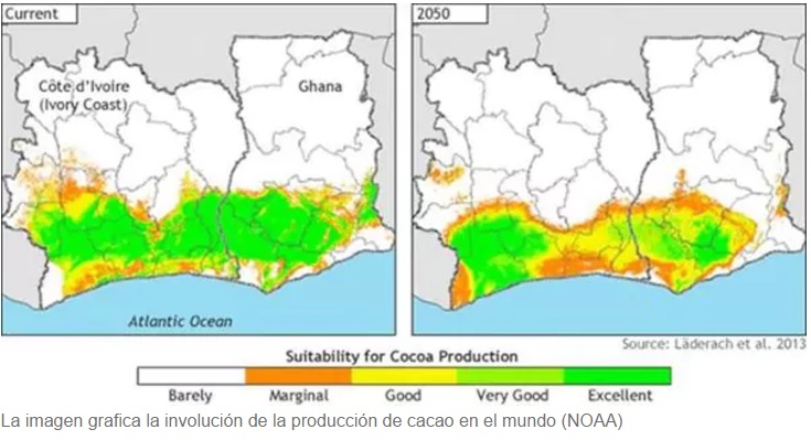 El informe que desarrollaron los investigadores brasileños muestra cómo según las previsiones que hay en la actualidad, las temperaturas de la zona podrían subir un poco más de dos grados centígrados en 2050, año en el que la producción de chocolate -se estima- sería bajísima, al punto de sufrir el riesgo de desaparecer. Los mismos estudios advirtieron que las lluvias no se incrementarán y aquí radica el principal problema: el árbol de cacao necesita mucha agua y humedad.