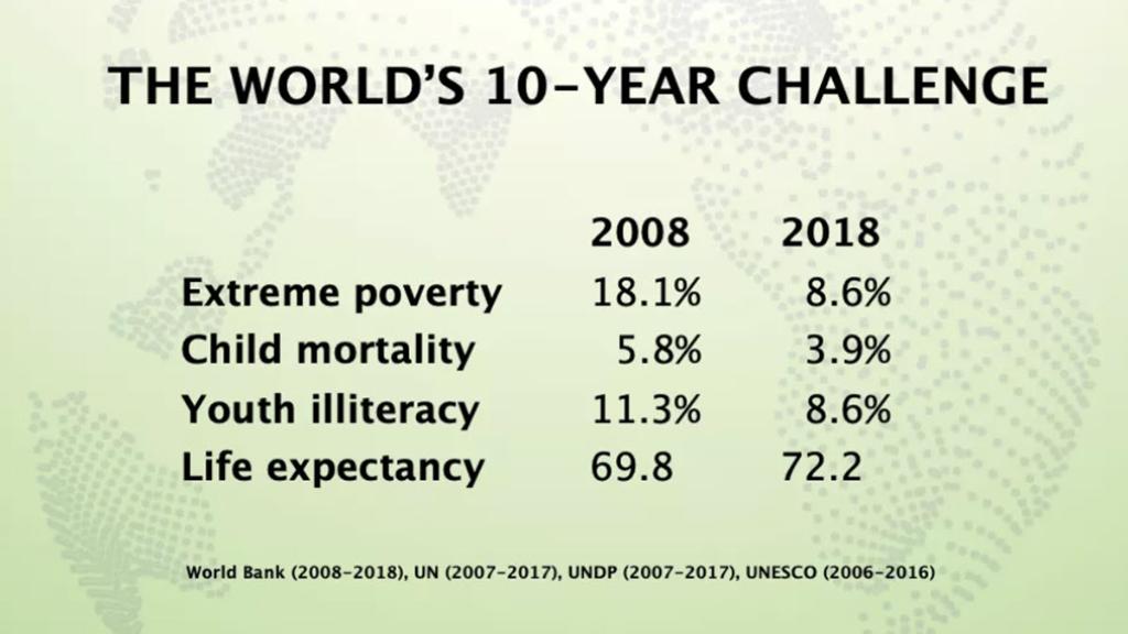 Bajo el título El #10YearsChallenge del mundo se puede ver que la pobreza extrema pasó de 18.1% en 2008 a 8.6% en 2018. También en baja, la mortalidad infantil pasó del 5.8% al 3.9% en la última década.