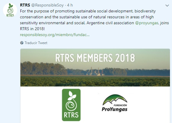 Con el objetivo de promover el desarrollo social sostenible, la conservación de la biodiversidad y el uso sustentable de los recursos naturales en áreas de alta sensibilidad ambiental y social, la asociación civil argentina Fundación ProYungas, se incorpora a RTRS para participar en su mesa de diálogo multisectorial y global.