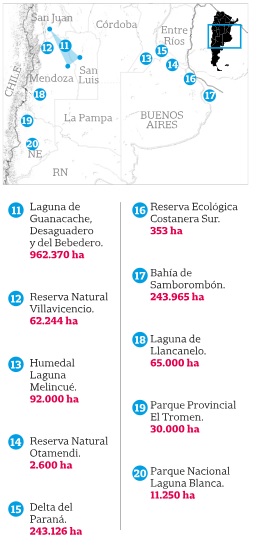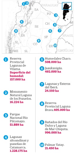 La Argentina tiene declarados 23 humedales de relevancia internacional, pero son muchos más los que forman parte del territorio nacional. Se estima que ocupan 600.000 km2, es decir, el 21,5% del país.