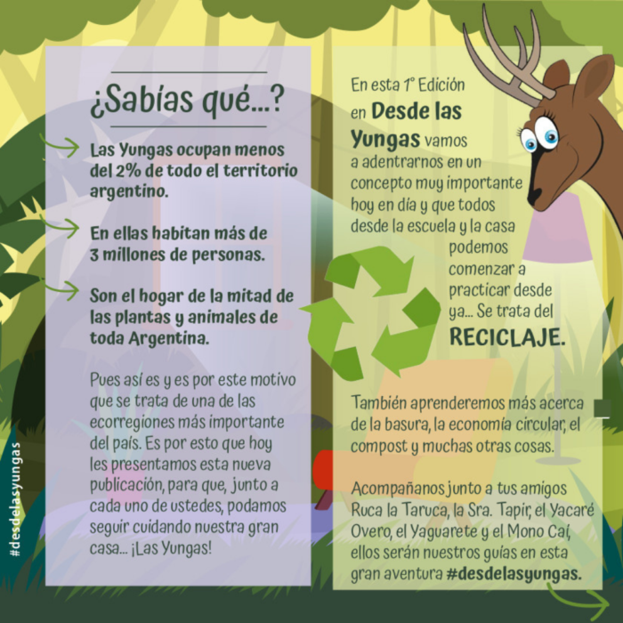 Las Yungas es una de las ecorregiones más importante del país: ocupan menos del 2% de todo el territorio argentino, en ellas habitan más de de 3 millones de personas y son el hogar de la mitad de las plantas y animales de toda Argentina. Es por esto que hoy les presentamos esta nueva publicación, para que, junto a cada uno de ustedes, podamos seguir cuidando nuestra gran casa… las Yungas. Acompañanos junto a Ruca la Taruca, la Sra. Tapir, el Yacaré Overo, el Yaguareté y el Mono Caí, ellos serán nuestros guías en esta gran aventura… #DesdeLasYungas.