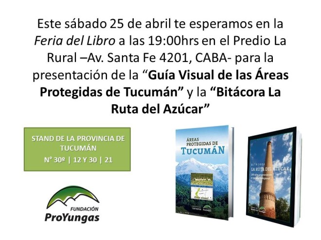 Queremos invitarte a visitar el stand de la Provincia de Tucumán en la Feria del Libro este día sábado 25, donde a partir de las 19:00hrs, estaremos realizando la presentación de la «Guía Visual de las Áreas Protegidas de Tucumán» y la«Bitácora La Ruta del Azúcar» bajo el concepto de Producción de azúcar y biodiversidad: dos mundos que se vinculan desde hace más de 100… Leer más