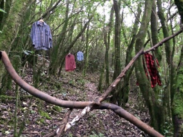Otro punto de atención en el recorrido fue cuando en una zona podían advertirse una decena de camisas leñadoras (mayoritariamente) colgadas en los árboles, pero atentamente planchadas y listas para ser usadas, que fue la producción realizada por Vallejo.