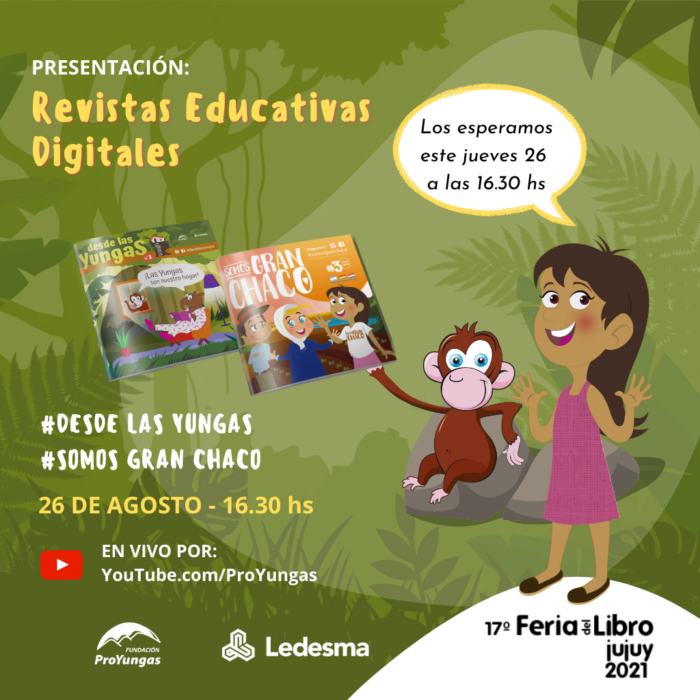 – Presentación de las Revistas Educativas Digitales «Desde las Yungas» y «Somos Gran Chaco». Nos acompañarán Sofía van Balen Blanken y Judith Mamaní de Fundación ProYungas y Leonor Calvó, Directora del Centro de Visitantes Ledesma ¡Conocé más sobre el Gran Chaco y las Yungas a través de estas propuestas lúdico educativas de uso libre y gratuito!.