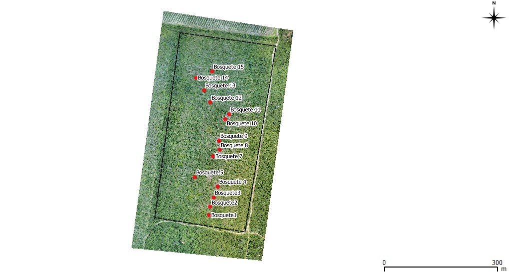 De forma complementaria en las zonas interfajas se realizaron bosquetes, en donde se plantaron 350 plantines de la misma especie. Estos bosquetes recorren todo el lote y aportan otro diseño de incorporación de árboles que nos permite sumar zonas a la cobertura vegetal implementada.